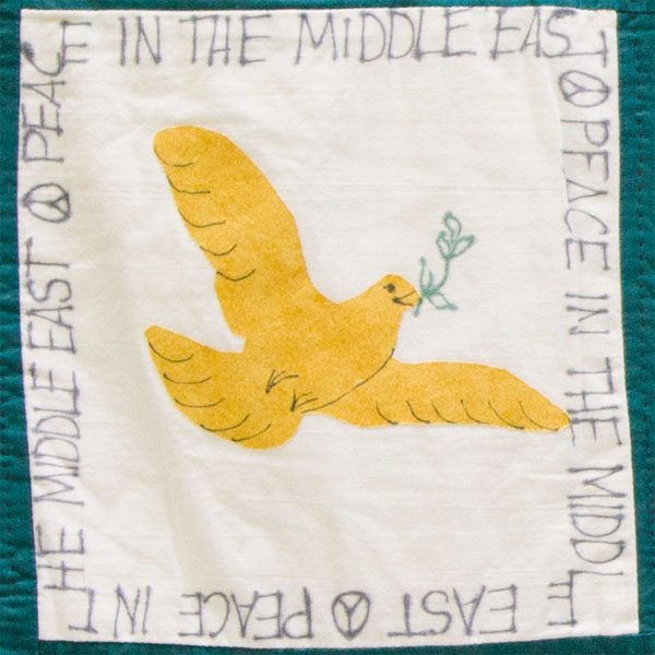 To the third through sixth grade classes of Agudus Achim Religious School, under the direction of Rabbi Tracy Klirs, the meaning of "Middle East Peace Quilt" is simple. We teach "Mitzvot" each month; this month our "Mitzvot" is "Rodef Shalom", (to pursue the peace). We teach that the pursuit of peace is one of the most God-like things we can do. Peace doesn't just happen. We need to seek out peace and make it happen. Discussing and contributing to the Middle East Peace Quilt for this lesson plan was a great way for the children to think of the peace process in the Middle East, and a wholeness in the world.