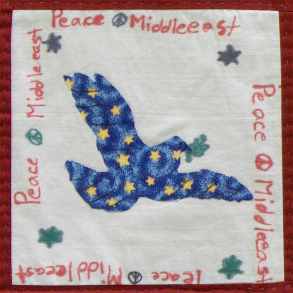 To the third through sixth grade classes of Agudus Achim Religious School, under the direction of Rabbi Tracy Klirs, the meaning of "Middle East Peace Quilt" is simple. We teach "Mitzvot" each month; this month our "Mitzvot" is "Rodef Shalom", (to pursue the peace). We teach that the pursuit of peace is one of the most God-like things we can do. Peace doesn't just happen. We need to seek out peace and make it happen. Discussing and contributing to the Middle East Peace Quilt for this lesson plan was a great way for the children to think of the peace process in the MIddle East, and a wholeness in the world.
