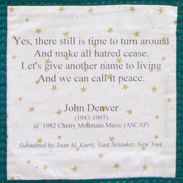 I chose to add this verse to the wonderful Middle East Peace Quilt with the purpose of keeping both John Denver's and my dream alive.